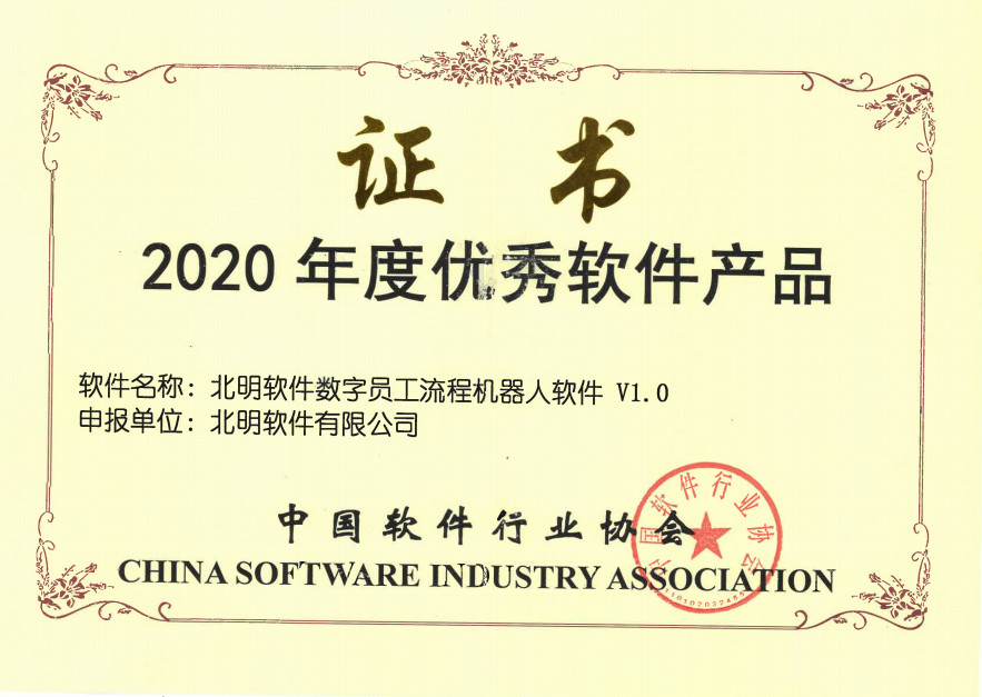 2020年度优异软件产品证书—数字员工流程机械人软件