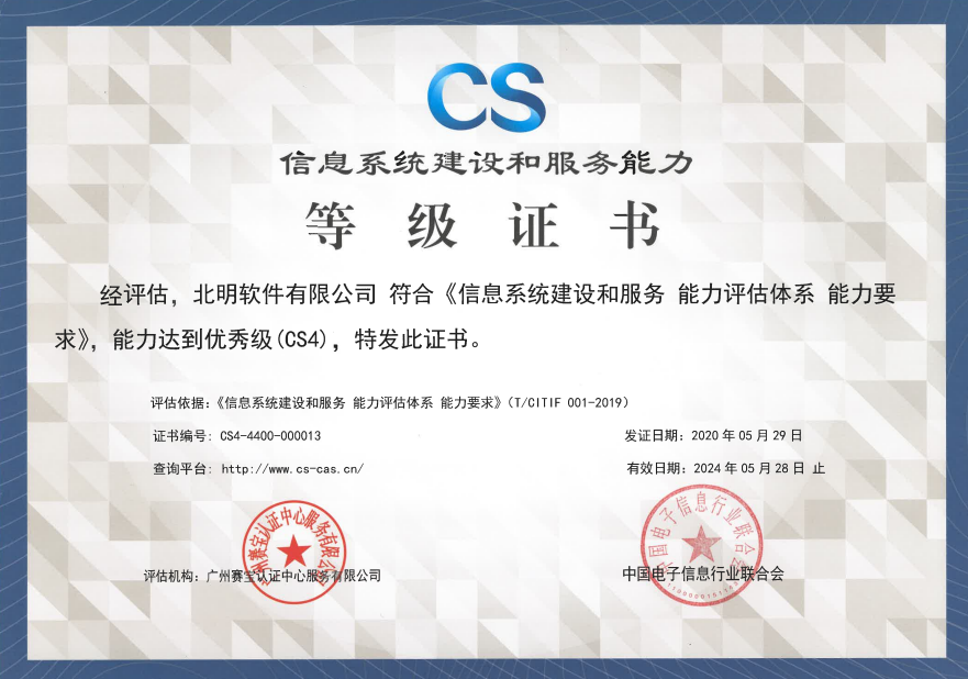 CS信息系统建设和服务能力品级证书